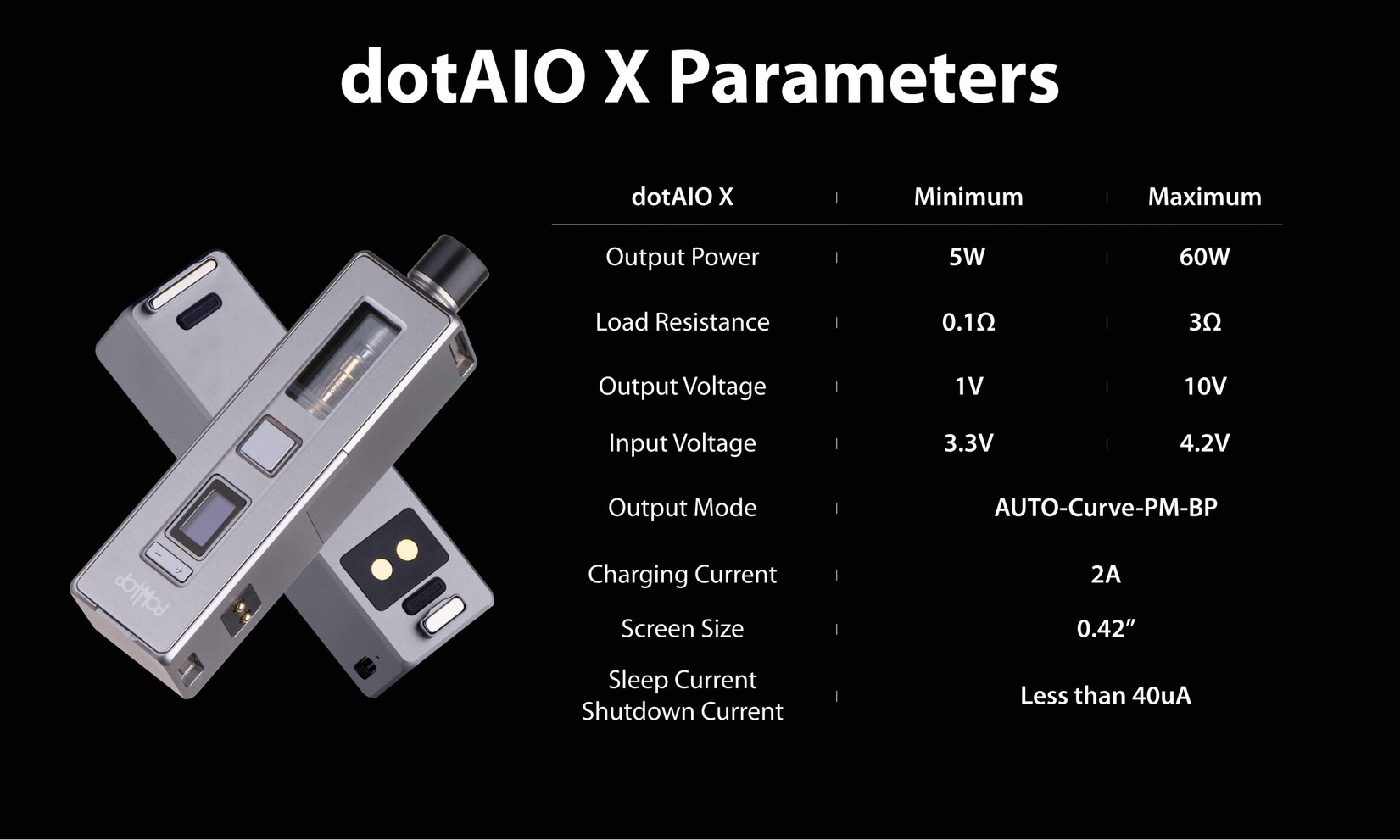 - 全模組化設計: dotAIO X 採用創新的模組化設計,允許用戶無縫切換不同的吸煙風格。無論您偏好 dotAIO 霧化器、Boro 霧化器,或是您的 RDA,dotAIO X 都能輕鬆滿足您的需求。只需更換霧化器模組,並輕鬆重新組裝,即可實現個性化的吸煙體驗。